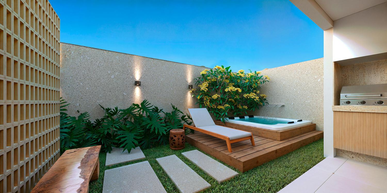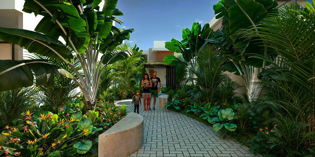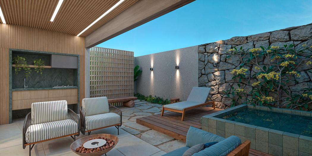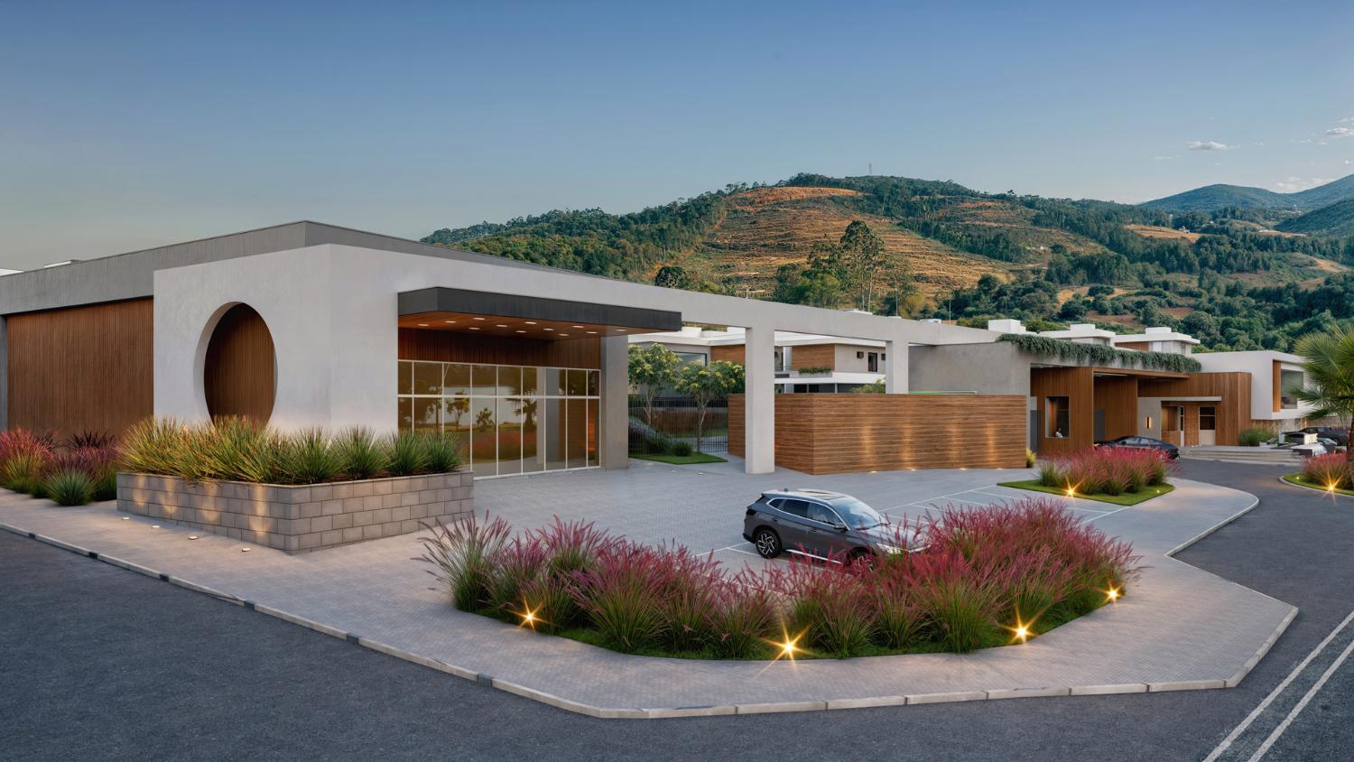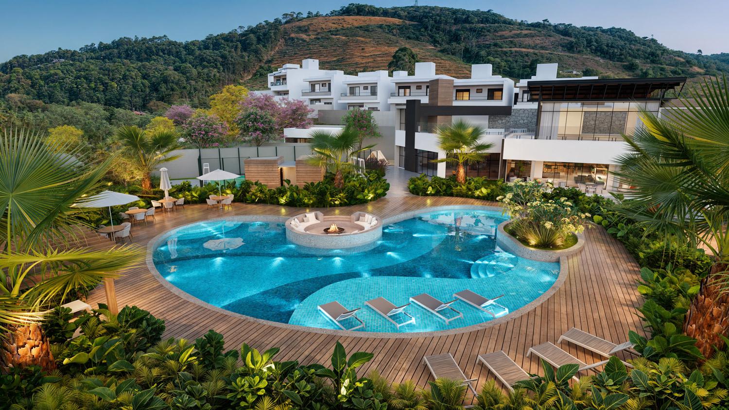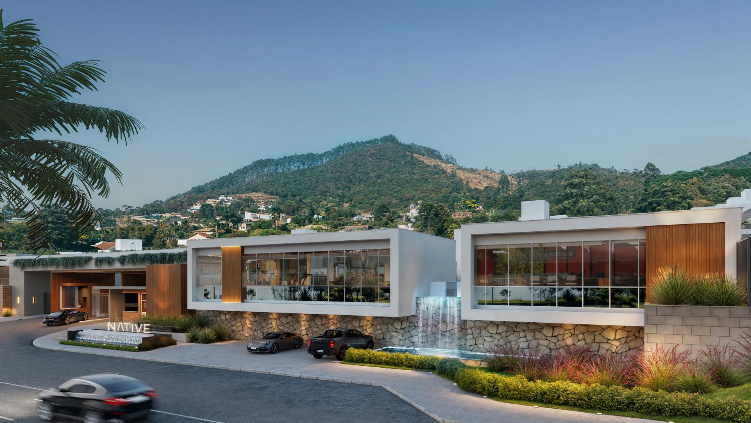 Localizado ao pé da serra, o paisagismo traz a vegetação local para dentro do empreendimento.